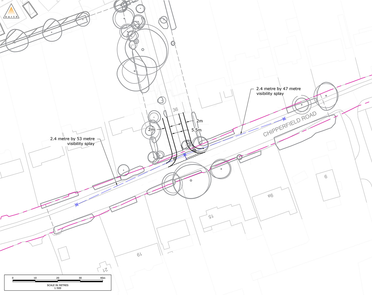 Our proposed car and vehicle access point for the new development was agreed in the previous Outline planning application. Vehicular access will be created to the south of the site off Chipperfield Road. This will be formed through the removal of the existing home at 36 Chipperfield Road with Hertfordshire County Council.