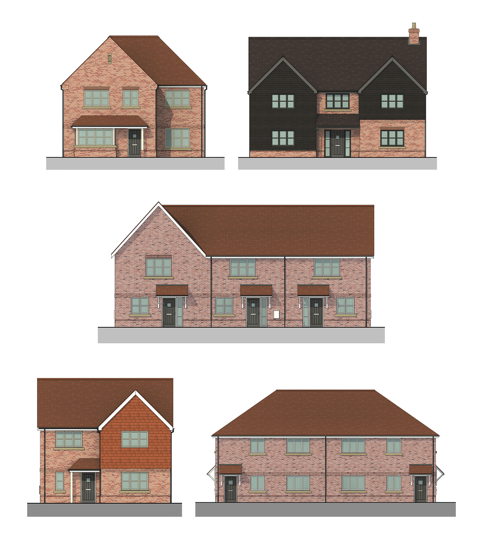 Homes will feature traditional red brick and black timber cladding, complemented by clay or slate tiled roofs. Subtle variations in brick colour and detailing create warmth and visual interest.