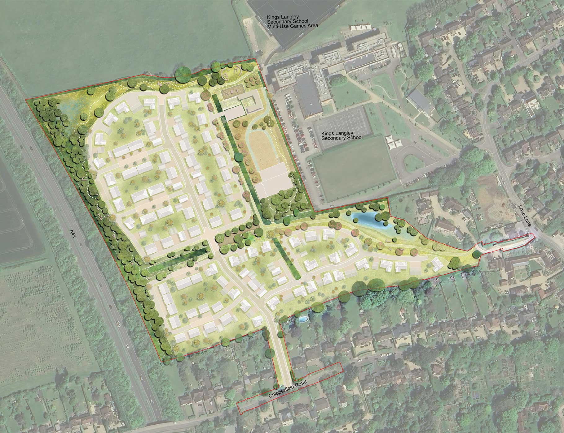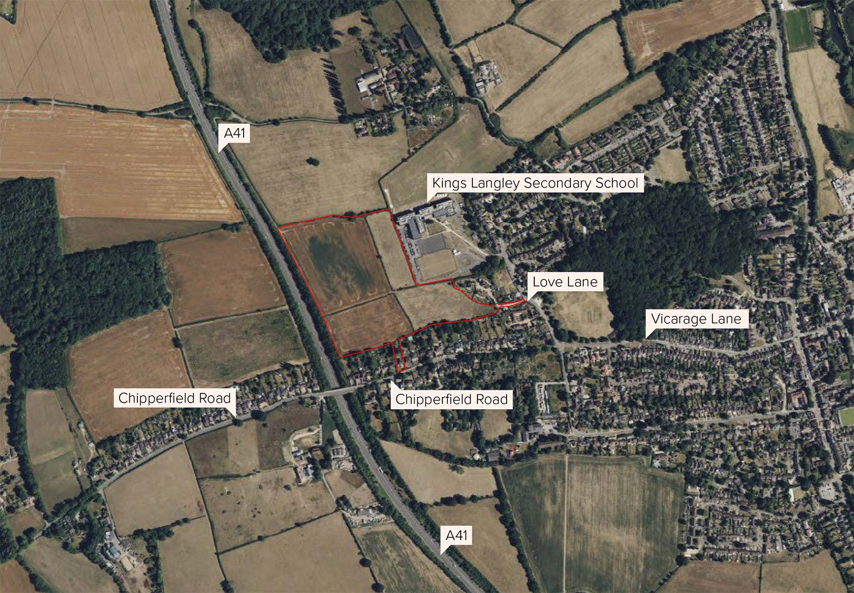 The site is located on the northwestern edge of Kings Langley, east of the A41 and west of Kings Langley Secondary School.