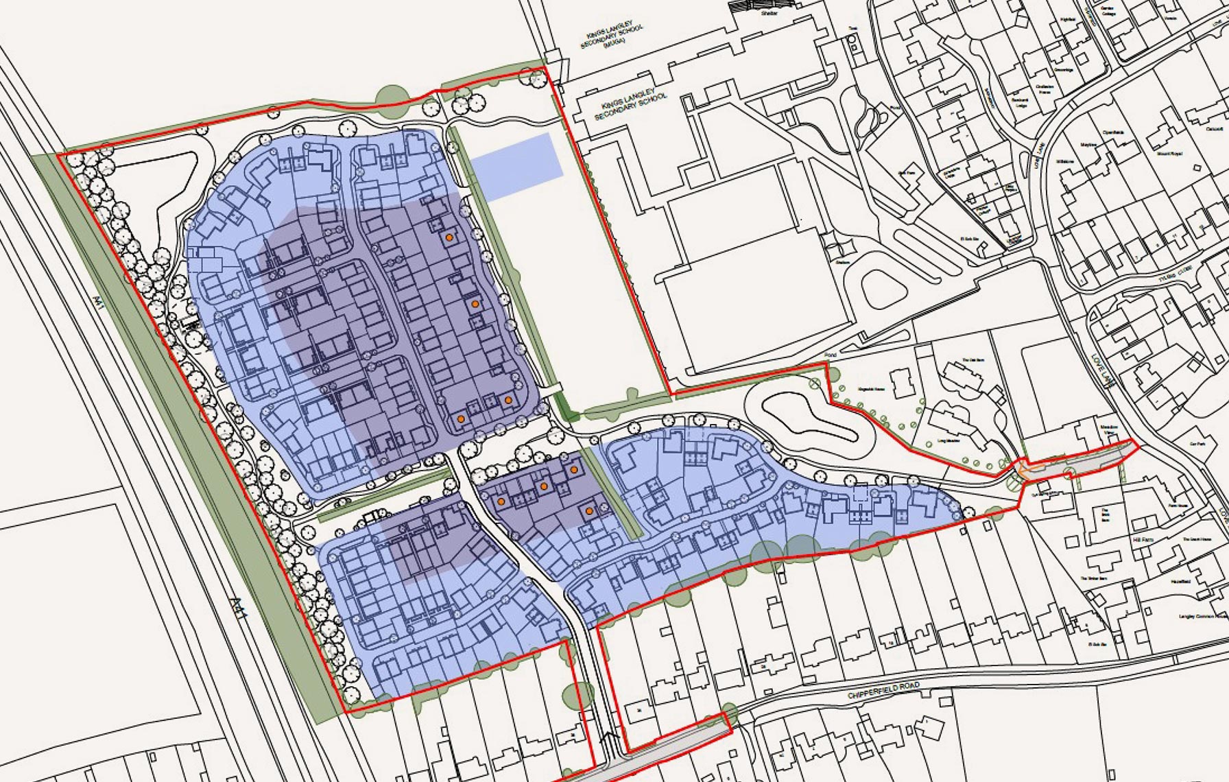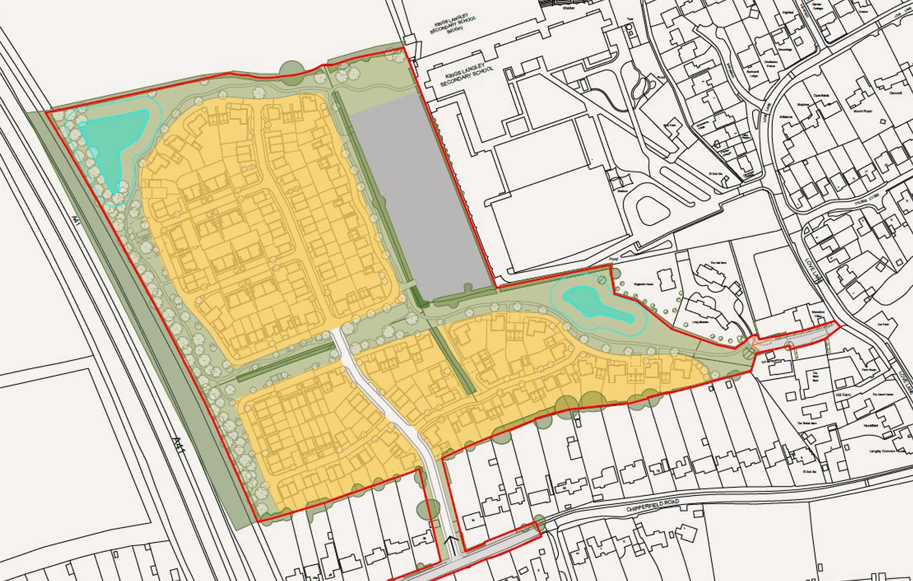 The application secured access via Chipperfield Road through the removal of the dwelling at 36 Chipperfield Road. The application establishes the principle of 150 new high-quality homes, including 50% affordable housing, the Farmstead, play scape, landscaping and sustainable access.