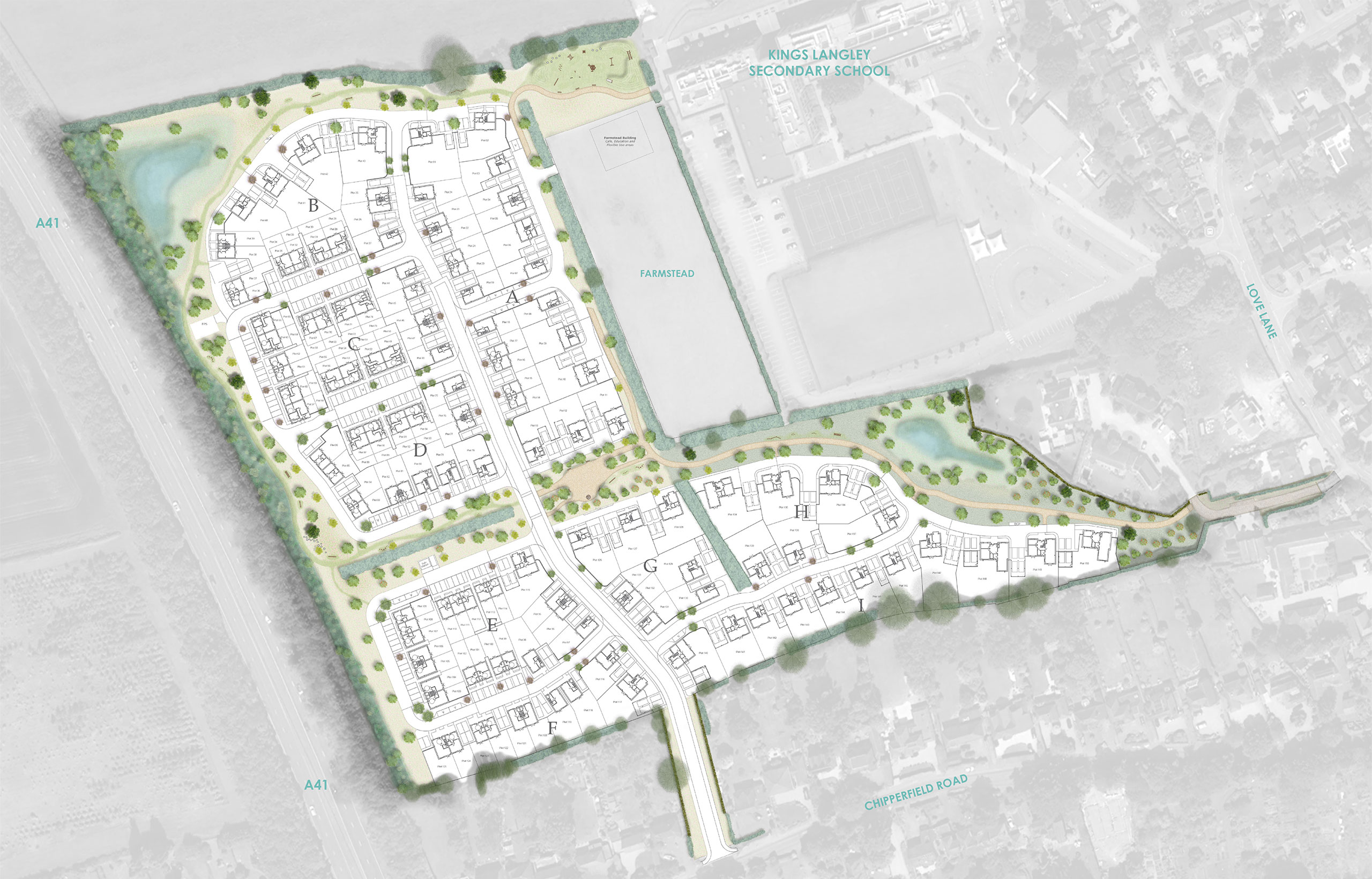Along the northern boundary maintains openness to the Green Belt, with wildflower meadows, walking routes, play areas, and a SuDS feature.
